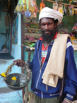 De fait, le pélerin afflue dans les rues, muni de son ballot et suivi de près par sa famille, souvent étendue. Il est ¨normalement¨ vêtu de blanc, tout de loongis superposés et s’appuyant sur un bâton. Il n’est pas rare d’en voir avec des charentaises aux pieds! Ils portent des colliers faits de perles appelés Malas, anisi qu’un balluchon et un tiffin (sorte de Tupperware en métal). Tous ensemble, ils se ruent gaiment dans les temples ou les échopes vendant essentiellement des colliers colorés, des bidons en plastique à remplir d’eau sacrée pour les prières à la maison, des photos-montages mettant en scene les Dieux vénérés, joliment présentés dans un grand mélange de couleurs et déjà encadrées, un assortiment varié d’objets en cuivre pour les ablutions, prières et autres offrandes. Les rues sont arpentées par bons nombre de saints hommes, les Saddhus. Ils arborent des tissus colorés à la taille ou autour de leur tête. De longues Chhettas (dreadlocks) pendent dans leur dos ou sont alors enroulees et posées sur leur crâne. Un point rouge est déposé sur le front. Ou alors trois traits.